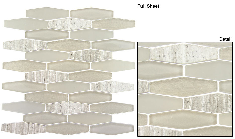 Published August 18, 2015 at 935 × 553 in str191 Tile size: 1 1/4″ x 4″ long hexagon Sheet size: 10″ x 11 1/2″ Sheet coverage: .80 square feet Tiles per sheet: 30 Tile thickness: 5/16″ (8mm) Grout joints: 1/16″ (2mm) This product is mesh mounted Glass and stone tile, Glazzio Tiles, str191